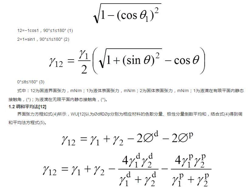 界面張力方程如式(4)所示,WU認為?d和?p分別為相應材料的色散分量、極性分量倒數(shù)平均和,結(jié)合式(4)得到調(diào)和平均法方程式(5)。