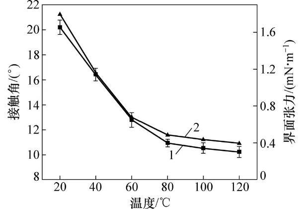 2)在20~120℃范圍內,DBTL在CBT500薄板上的靜態(tài)接觸角和CBT500/DBTL樹脂體系的界面張力均隨著溫度的升高而減小。不同溫度區(qū)間內,二者的減小趨勢不同:在20~60℃范圍內,接觸角和界面張力隨溫度升高,下降趨勢最大;在60~80℃范圍內,下降趨勢次之;在80~120℃范圍內,下降趨勢平緩。
