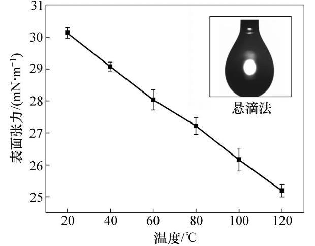 采用瑞典Biolin Scientific Theta光學接觸角測量儀的懸滴法測量20,40,60,80,100和120℃溫度下DBTL的表面張力。將DBTL緩慢從自制滴管中滴出,當液滴外形出現輕微縮頸時,保溫30 s,測量該狀態(tài)下表面張力,每個溫度點測5次求算術平均值作為該溫度下表面張力。