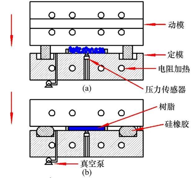 測定薄板分別由2種材料CBT500和PP制成,用于一定溫度下不同材料液滴在相應薄板上靜態(tài)接觸角的測量。采用抽真空熱壓工藝制備光滑薄板,成型工藝參數如表1所示,具體過程為:采用信易SCD?20μ/30H干燥機對CBT500和PP顆粒進行干燥,干燥溫度、時間分別為80℃和24 h。采用HH?138的精密烤箱對干燥后CBT500和PP顆粒分別進行預加熱,加熱溫度分別為140℃和160℃,加熱時間均為0.5 h。將預加熱CBT500和PP顆粒分別倒入溫度為130℃和150℃的模具中,采取抽真空熱壓工藝制備CBT500和PP光滑薄板。抽真空熱壓工藝包括6個階段:1)動模降至密封圈;2)抽真空;3)施壓;4)保壓;5)冷卻;6)開模取件。為獲得良好的密閉空間,動模應迅速下降至密封圈并微壓,如圖2(a)所示。抽真空后,施加壓力將CBT500和PP顆粒壓實,制成相應光滑薄板,如圖2(b)所示。