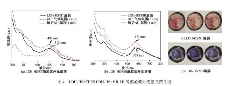 此外,為了進(jìn)一步說明LDH-HS/染料復(fù)合LB膜的酸致變色敏感性,還制備了LDH-HS/染料混合滴膜作為對比,并進(jìn)行了相關(guān)數(shù)據(jù)的表征。LDH-HS/染料混合滴膜的紫外可見數(shù)據(jù)如圖4所示。圖4(a)是LDH-HS/ST混合滴膜酸堿氛圍變化的紫外光譜,從數(shù)據(jù)中可以看出:滴膜被放在HCl氣體中1 min時(shí)間,最高峰位置從499 nm處向右移動到了512 nm處,盡管發(fā)生了一定的位移,但是移動范圍是比較微小的。再將該滴膜放置在NH3氛圍中1 min,特征峰又移動回原始位置。圖4(b)中顯示出LDH-HS/MB滴膜在HCl氛圍中一段時(shí)間后峰位置從578 nm藍(lán)移到573 nm,在NH3氛圍中峰位置幾乎回到了原位置,但是位移范圍也是相當(dāng)小的。與此同時(shí),觀察兩個(gè)滴膜基底片的顏色(圖4(c)和4(d)),發(fā)現(xiàn)它們在酸堿氛圍后的顏色變化不是很明顯。