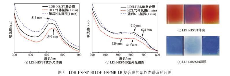 圖3(a)和3(b)分別顯示的是LDH-HS/ST和LDH-HS/MB多層LB復(fù)合膜沉積在石英底片上測得的UV光譜,以及經(jīng)1 min HCl氣體氛圍處理后和1 min NH3氣體氛圍處理后的UV變化光譜圖。圖3(c)和3(d)對應(yīng)展示了LDH-HS/ST和LDH-HS/MB復(fù)合膜酸堿氣體氛圍下石英片顏色變化前后對比圖。