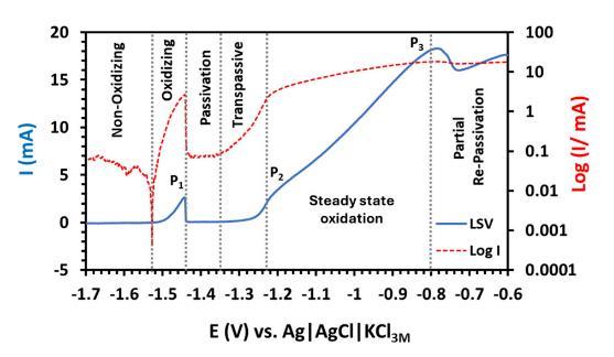 圖1電化學(xué)線性掃描伏安圖(LSV,藍色實線)及液滴電流的對數(shù)圖(紅色虛線),針對1 M NaOH中的鎵銦合金,掃描速率為0.5 mV/s。垂直虛線將圖中標(biāo)記的六個反應(yīng)區(qū)域區(qū)分開來,標(biāo)記出三個氧化峰P1、P2和P3。