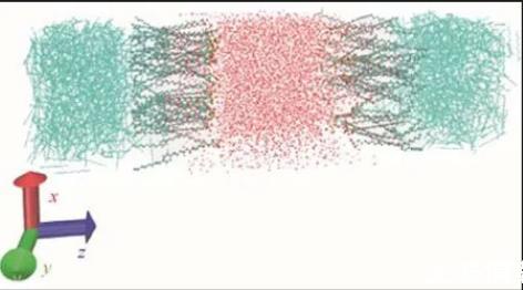 在進(jìn)行分子動(dòng)力學(xué)模擬之前構(gòu)建出合理的力場是極為重要的工作。本文通過Autom-ated Topology Builder(ATB)and repository生成的GROMOS系列力場參數(shù),利用現(xiàn)有的數(shù)據(jù)庫以及量子化學(xué)進(jìn)行計(jì)算,同時(shí)它可以充分考慮到分子中的對稱結(jié)構(gòu),使其反映出的分子性質(zhì)及參數(shù)更為精確。但ATB只能處理原子數(shù)小于40的分子,對于分子數(shù)大于40的分子結(jié)構(gòu)需進(jìn)行拆分。在獲取準(zhǔn)確的電荷及鍵參數(shù)之后利用packmol程序定向排列分子將其堆砌成立方體結(jié)構(gòu)。此外,本文選取的油-水界面需使表面活性劑平均分布在水相兩側(cè),親水基靠近水相,疏水基靠向油相。圖2為初始狀態(tài)下體系截圖,其中中間紅色部分為水分子,左右兩側(cè)藍(lán)色部分為癸烷分子,油水中間即OPES分子。