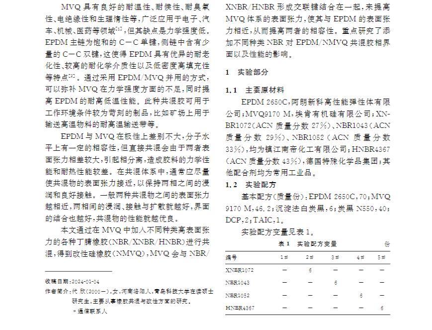 結(jié)果表明:NBR與MVQ并用可減小水接觸角,提高表面張力,與EPDM共混,能顯著增加相界面厚度,拉伸強(qiáng)度和拉斷伸長率提升;添加NBR1043的共混膠耐高溫性能優(yōu)異,添加XNBR1072的共混膠耐熱氧老化性能出色。