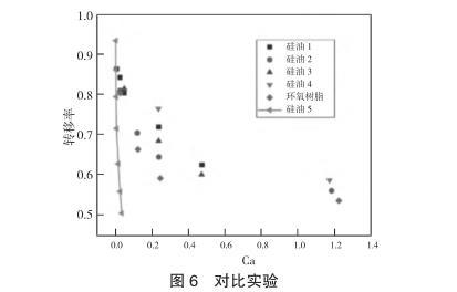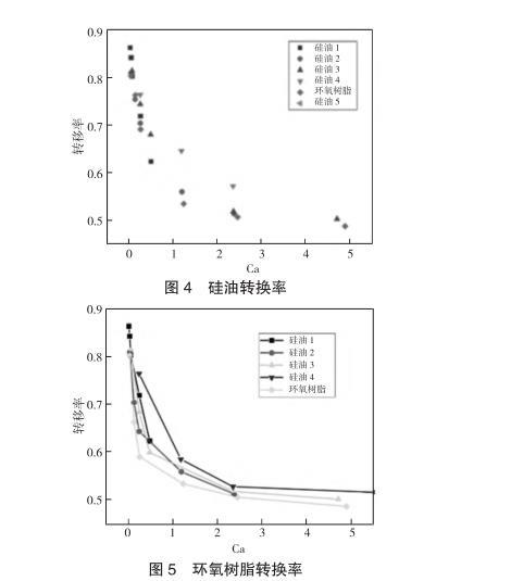 對不同黏度以及拉伸速度下的膠液進(jìn)行測量并計(jì)算轉(zhuǎn)移率,如圖4所示,在忽略慣性力的條件下,采用無量綱數(shù)Ca來表示轉(zhuǎn)移率,對于表面張力相似且不同黏度的四種甲基硅油的轉(zhuǎn)移率有著相似的收斂情況。為了進(jìn)一步印證Ca對轉(zhuǎn)換率的影響,引入與甲基硅油不同表面張力的環(huán)氧樹脂進(jìn)行對比實(shí)驗(yàn),如圖5所示,表面張力較大的環(huán)氧樹脂的轉(zhuǎn)換率會比甲基硅油小,但整體趨勢相差不大,均會收斂到一定數(shù)值。之后,為了了解慣性力對轉(zhuǎn)移率的影響,選擇黏度較小的膠液進(jìn)行實(shí)驗(yàn),同時加大移液針直徑使其脫離微量點(diǎn)膠的范圍,以提高慣性力對膠液傳遞的影響,如圖6所示,在通過增加膠液體積以提高慣性力影響的實(shí)驗(yàn)中,膠液轉(zhuǎn)移率的變化與之前有極大差異。