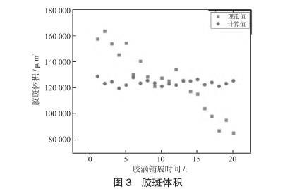 在液橋斷裂后,轉(zhuǎn)移到點(diǎn)膠面上的膠液在自身表面張力的作用下形成圓潤的膠斑,在理想狀態(tài)下膠斑可視為球冠狀,其體積可用球冠狀公式求得。實(shí)驗(yàn)主要使用的膠液為甲基硅油,其表面張力只有21 mN/m,低于環(huán)氧樹脂,在基板上由甲基硅油形成的膠斑在穩(wěn)定狀態(tài)下與環(huán)氧樹脂的形狀不同,因此不能將其視為球冠狀,需要其他計(jì)算體積的方法。為了提高計(jì)算的準(zhǔn)確性通過灰度處理、二值化等圖像處理的方法提取膠斑的輪廓信息,之后通過提取到的坐標(biāo)信息來擬合膠斑輪廓的函數(shù),使用旋轉(zhuǎn)積分的方法來計(jì)算膠斑的體積。之后為了驗(yàn)證計(jì)算的準(zhǔn)確性,在其他物性條件相同時,將5 000 cps的甲基硅油、3 mm/s的移液針抬升速度的實(shí)驗(yàn)條件下膠斑的鋪展過程作為研究對象。用顯微鏡錄制在液橋斷裂后膠斑的鋪展情況,以0.016 s為間隔,截取20張膠斑的圖片分別用公式和積分法進(jìn)行膠斑體積的計(jì)算,結(jié)果如圖3所示。