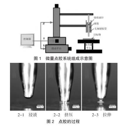本課題組研制了一種基于移液針轉(zhuǎn)印原理的微量點(diǎn)膠系統(tǒng),該點(diǎn)膠系統(tǒng)所形成的膠斑直徑可達(dá)到數(shù)十微米,膠滴體積可達(dá)飛升-皮升的范圍。該系統(tǒng)的結(jié)構(gòu)如圖1所示。該系統(tǒng)由出膠單元、驅(qū)動單元和控制單元組成。其中,出膠單元為系統(tǒng)的核心,其主要包含微移液針和毛細(xì)儲膠管兩個關(guān)鍵元件,移液針通過在儲膠管內(nèi)的上下往復(fù)運(yùn)動,實(shí)現(xiàn)膠液向基板的微量轉(zhuǎn)移。驅(qū)動單元由X/Y/Z三個方向的驅(qū)動電機(jī)和微升降平臺組成,用于驅(qū)動微移液針及點(diǎn)膠工件的運(yùn)動??刂茊卧蒔LC控制系統(tǒng)和LaBview開發(fā)的控制面板組成,實(shí)現(xiàn)對電機(jī)運(yùn)動的自動控制。