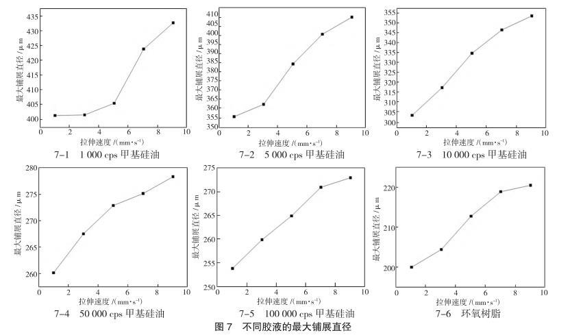 點(diǎn)膠結(jié)果最直觀的顯示就是形成膠斑達(dá)到穩(wěn)定狀態(tài)時膠斑的直徑,因此對膠斑的直徑進(jìn)行研究。選取5種表面張力相似黏度不同的甲基硅油以及黏度為10 000 cps的環(huán)氧樹脂作為實(shí)驗(yàn)用膠。移液針抬升速度分別設(shè)置為1 mm/s,3 mm/s,5 mm/s,7 mm/s,9 mm/s。使用的移液針直徑為200μm。實(shí)驗(yàn)結(jié)果如圖7所示。