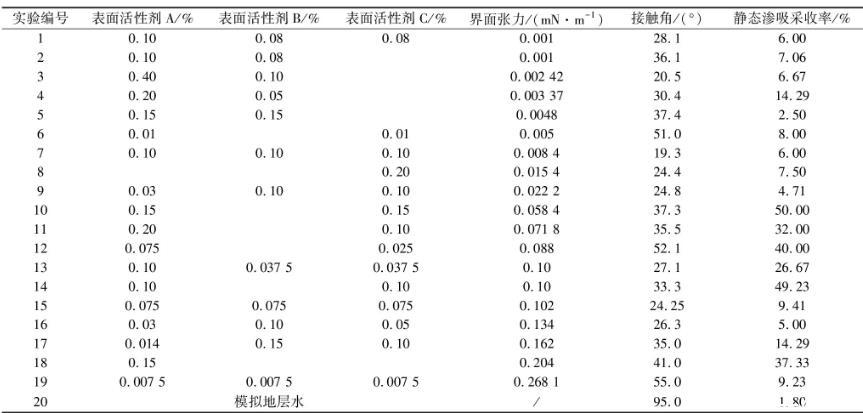 根據(jù)國內(nèi)外學(xué)者的研究,滲吸液對滲吸的影響主要是改變油水界面張力、潤濕性、乳化性和pH值。乳化性主要是通過乳化分散,從而增強油滴在巖心孔道內(nèi)的流動能力;pH值則主要是影響滲吸液的乳化能力。本次實驗采取靜態(tài)滲吸的方式,乳化性的作用相對較小,故滲吸液配制指標為界面張力與潤濕性。