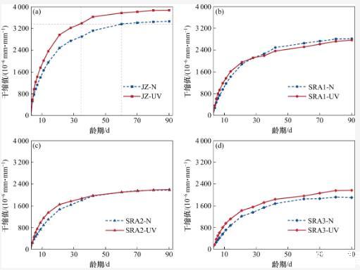 從圖3中可以觀察到,隨著齡期的延長,干縮曲線SRA2-UV逐漸接近于干縮曲線SRA3-UV,而SRA3-UV的干縮值沒有進(jìn)一步降低。這表明上述分析是合理的。在強(qiáng)紫外線輻射下,當(dāng)減縮劑的摻量超過3%時(shí),其孔隙溶液中的SRA濃度超過臨界濃度(CMC),進(jìn)一步增大摻量不能增強(qiáng)SRA在該應(yīng)用環(huán)境中的減縮效果。