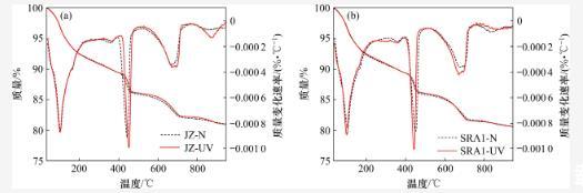 通過TG-DTG程度對比分析60 d齡期時2種環(huán)境條件下水泥水化,熱重分析結(jié)果圖6和表4所示?;瘜W結(jié)合水和氫氧化鈣的含量可以直觀地反映水化速率和水化程度。如表4所示,經(jīng)過強紫外線照射后,各組樣品的化學結(jié)合水含量和氫氧化鈣含量呈下降趨勢,這是因為強紫外線照射下樣品中的自由水會更快地蒸發(fā),最終導(dǎo)致水化程度降低。此外,對比2種環(huán)境下的碳酸鈣含量發(fā)現(xiàn),強紫外輻射會促進水泥石的碳化。熱重分析結(jié)果與已有的研究結(jié)果相似。