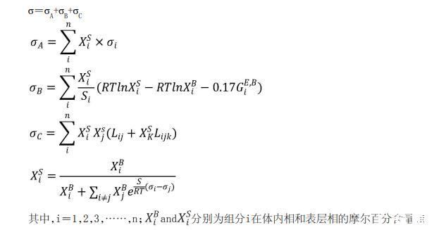 在一些實施方式中,基于表面張力模型和最優(yōu)擬合參數(shù)計算高階多元合金的表面張力包括: