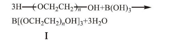 將0.12 mol聚乙二醇和0.04 mol硼酸依次裝入帶有攪拌器、分水器、回流冷凝器的三口燒瓶中,并連接減壓裝置。加熱至120℃,在負壓下進行反應至出水量不變,酯化過程如下所示: