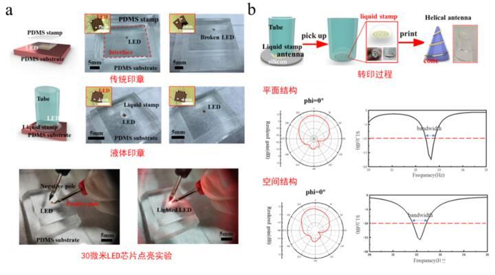 當液體印章與待轉(zhuǎn)印器件/單元結(jié)合時,液滴對器件進行包裹,進而實現(xiàn)保護器件的作用。相比于傳統(tǒng)彈性印章轉(zhuǎn)印方法,液體的流變特性充分發(fā)揮作用,使得薄膜器件更容易轉(zhuǎn)印到多種復雜的空間曲面上。通過對固-液界面粘附力的理論分析,提出了基于液滴印章的轉(zhuǎn)印技術(shù),實現(xiàn)了柔性薄膜的高度精確可控轉(zhuǎn)印,并通過實驗證實了理論模型的正確性與該轉(zhuǎn)印方法的可行性。研究人員通過液體印章轉(zhuǎn)印方法,成功實現(xiàn)了30微米超薄LED芯片的轉(zhuǎn)印集成(圖2a為傳統(tǒng)印章和液滴印章轉(zhuǎn)印對超薄LED芯片轉(zhuǎn)印結(jié)果的對比)與錐螺旋微天線與異形曲面的轉(zhuǎn)印集成(圖2b)。此方法利用了表面張力和毛細作用,可以實現(xiàn)轉(zhuǎn)印期間印章-薄膜作用力的精確調(diào)控,進而能夠高效、高質(zhì)量地完成超薄器件的轉(zhuǎn)??;利用二維制備工藝和轉(zhuǎn)印技術(shù),實現(xiàn)了立體空間微結(jié)構(gòu)和異形界面的集成,為曲面電子器件的設(shè)計與制備提供了一種新的方案。