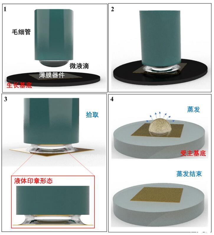 針對當前轉(zhuǎn)印技術(shù)中存在的問題,研究人員結(jié)合接觸式和非接觸式轉(zhuǎn)印的特點,提出了一種基于表面張力的液滴轉(zhuǎn)印方法,利用液體的流變特性,通過毛細管對液滴形態(tài)的控制,調(diào)控固-液界面的粘附力,從而實現(xiàn)柔性器件的轉(zhuǎn)印,該方法減少了超薄柔性器件的轉(zhuǎn)印過程中印章對器件的損傷,同時也為曲面電子器件的制造提供了新的思路。