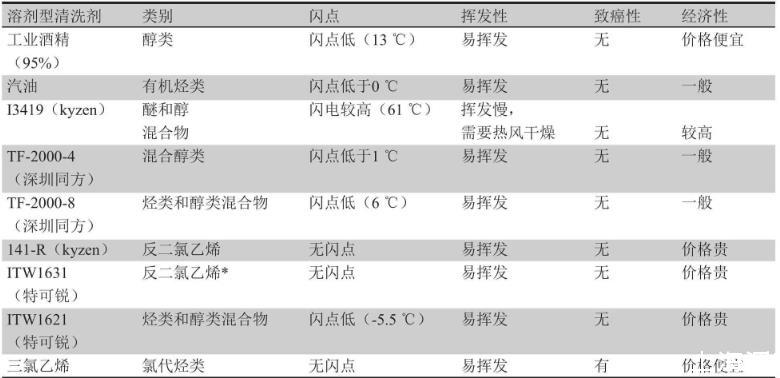 手工清洗采用的都是溶劑型的清洗劑,溶劑類的清洗劑應(yīng)用濃度都為100%。所有的溶劑通過溶解污染物而起作用,即將其分解成更小的顆粒,通過刷洗或沖洗并將污染物帶入溶液中,使其遠離被清潔的表面。大致分為有機烴類、醇類、氯代烴類、氟代烴類清洗劑。每種溶劑都有它的優(yōu)缺點,而選擇哪種清洗溶劑將主要取決于要被去除的雜質(zhì)的類型和電子組件的材料構(gòu)成。