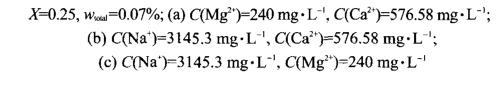 配制溶液所用的是高礦化度且含有高濃度二價(jià)金屬離子的模擬礦化水,從上面的實(shí)驗(yàn)結(jié)果中看出,HDAPS/SDS混合體系在高鹽條件下可以與原油達(dá)到超低界面張力。考慮到在實(shí)際應(yīng)用過程中地層水的礦化度可能發(fā)生變化,恒定模擬水中Na+、Mg2+和Ca2+中兩種金屬離子的濃度,考察了Na+、Mg2+和Ca2+濃度變化對HDAPS/SDS混合體系與原油界面張力的影響,實(shí)驗(yàn)結(jié)果如圖3所示。從圖中可以看出,模擬水中Na+濃度在1500-4500 mg·L-1、Mg2+濃度在120-360 mg·L-1和Ca2+濃度在200-800 mg·L-1范圍內(nèi)變化時(shí),HDAPS/SDS混合體系與原油的界面張力均可達(dá)到超低界面張力,這說明在高礦化度和高濃度二價(jià)金屬離子條件下,HDAPS/SDS混合體系也表現(xiàn)出非常優(yōu)異的界面活性。
