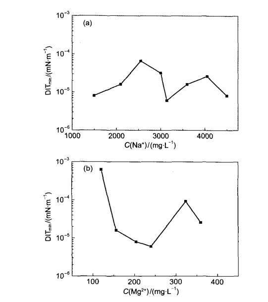 圖3金屬離子濃度對HDAPS/SDS混合表面活性劑溶液與原油的動(dòng)態(tài)界面張力的影響