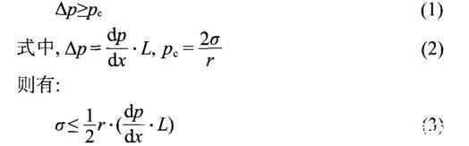 第三,HDAPS/SDS混合體系的動(dòng)態(tài)界面張力達(dá)到超低界面張力的時(shí)間非常短,且能夠在極低的平衡界面張力下維持。由于在實(shí)際驅(qū)油過程中,驅(qū)油體系是在流動(dòng)的狀態(tài)下與原油接觸,在短時(shí)間內(nèi)達(dá)到超低界面張力,對原油從巖石上啟動(dòng)非常有利。而且,HDAPS/SDS混合體系與原油的界面張力在總濃度超過0.04%后就可以達(dá)到極低的10-5mN·m-1量級。對于存在于半徑為r的毛細(xì)管中長度為L的剩余油滴,當(dāng)油滴兩端的驅(qū)動(dòng)壓差Δp大于等于毛細(xì)管壓力pc時(shí),剩余油滴才能夠活化啟動(dòng),7即有: