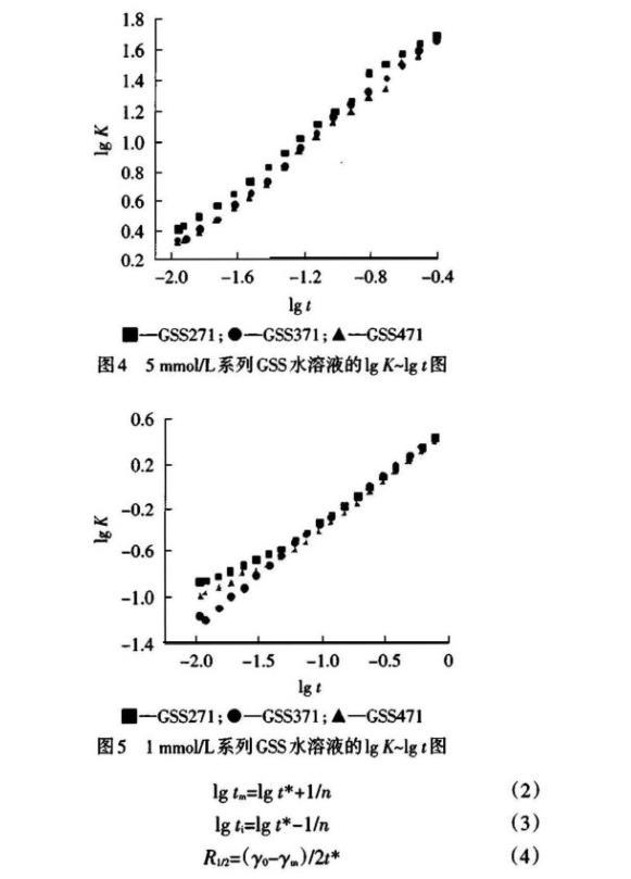 測得的DST數(shù)據(jù)經(jīng)公式(1)處理后,令lgK表示lg[(γ0-γt)/(γt-γm)],以lgK對lgt作圖,結(jié)果見圖4~5。從直線的斜率與截距可以得到DST的特性參數(shù)n與t*值,并可根據(jù)公式(2)~(4)進(jìn)一步得到誘導(dǎo)區(qū)結(jié)束時間ti、介平衡開始時間tm及t1/2時表面張力下降速率R1/2,結(jié)果見表2。