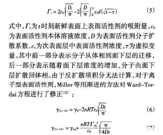 對c<cmc的表面活性劑溶液,Ward和Tordai根據(jù)擴(kuò)散控制機(jī)理提出了描述表面吸附動力學(xué)的模型: