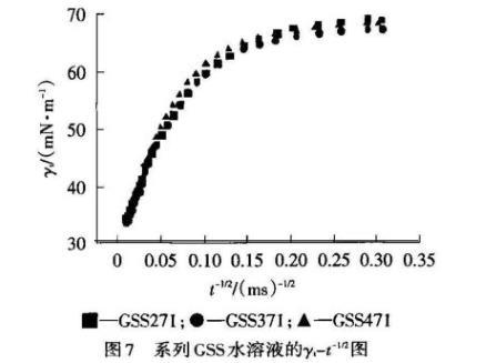 由表2可知,GSS271、GSS371、GSS471的n值基本相同,說明吸附初期(t→0)連接基長度對表面活性劑分子從本體溶液中擴(kuò)散到面下層的過程影響較小。GSS471的t*最大,反映吸附后期(t→∞)表面活性劑分子從面下層吸附到溶液表面的勢壘最小,這與GSS471柔性連接鏈易彎曲導(dǎo)致兩條疏水鏈間作用增強(qiáng),更易在表面定向排列有關(guān)。GSS271的ti最小,表明誘導(dǎo)區(qū)結(jié)束的時間最早,R1/2最大表明動態(tài)表面活性最好,這與其連接基最短且分子體積較小有關(guān)。