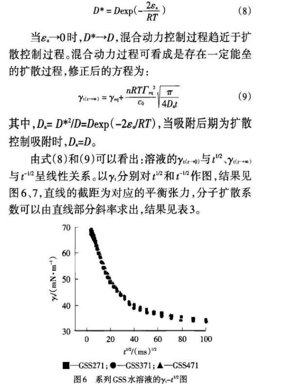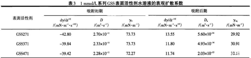 從表3可知,吸附初期GSS的擴(kuò)散系數(shù)較吸附后期大2~3個數(shù)量級。表明GSS分子自本體溶液擴(kuò)散到次表面的速度遠(yuǎn)大于在氣液界面與次表面之間的交換速度,因為在吸附初期(t→0),新鮮表面不存在吸附勢壘,屬擴(kuò)散控制吸附;吸附后期(t→∞),在氣液界面吸附的GSS分子由于相互作用產(chǎn)生的位能壘、離子頭基間的靜電斥力以及分子的定位重排等共同作用導(dǎo)致了混合動力擴(kuò)散控制。