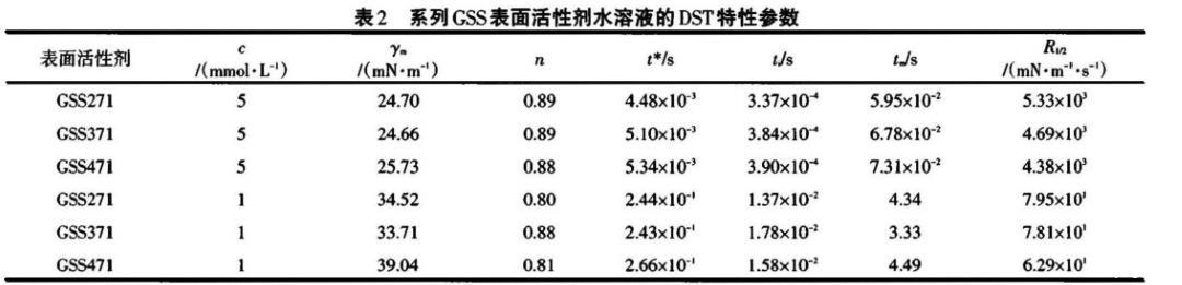 以GSS271為例,濃度越高,表面活性劑分子的擴(kuò)散推動力越大,于氣液界面吸附越快,DST下降越顯著,因而誘導(dǎo)區(qū)結(jié)束的時間越早,越易達(dá)到介平衡,這與γm、ti、tm較小吻合;t*值隨濃度增大而減小,表明吸附后期勢壘隨濃度增大而增大,因為濃度較高時,更多的GSS271分子吸附于表面,由于空間位阻、分子間靜電斥力的影響,阻礙了新的GSS271分子吸附,吸附勢壘變大。濃度高時,R1/2大,動態(tài)表面活性好。