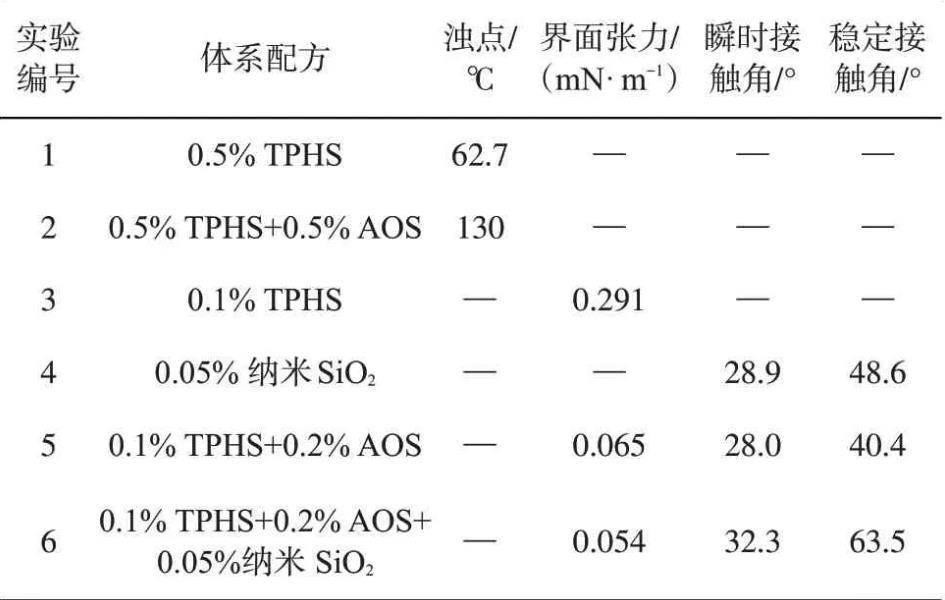 表面活性劑之間通過復配可以彌補其性能單一的缺點。陰離子表面活性劑和非離子表面活性劑的復配使其具有良好的協(xié)同效應(yīng),既可彌補陰離子表面活性劑不耐鈣鎂離子的不足,又可以提高非離子表面活性劑的濁點。由于TPHS的親水基為非離子基團,復配陰離子表面活性劑AOS可以提高表面活性劑的濁點,實驗結(jié)果如表1所示,TPHS與AOS復配后,濁點大大提高;TPHS在地層吸附量較大,復配納米SiO2在減少地層吸附的同時可以提高滲吸速率。0.1%TPHS、0.05%SiO2、0.1%TPHS+0.2%AOS和0.1%TPHS+0.2%AOS+0.05%SiO2體系與原油間的界面張力及其在親水載玻片上的接觸角測試結(jié)果如表1所示。在80℃下,復合體系0.1%TPHS+0.2%AOS和0.1%TPHS+0.2%AOS+0.05%SiO2與原油間的界面張力均達到10-2mN/m數(shù)量級,與TPHS單一表面活性劑相比,復配體系更有效地降低了油水界面張力。在納米SiO2與表面活性劑的協(xié)同作用下,低張力納米流體(0.1%TPHS+0.2%AOS+0.05%SiO2)在親水載玻片上的接觸角遠大于單獨納米SiO2或表面活性劑的溶液的。這是因為表面活性劑在納米SiO2顆粒表面的吸附使得玻璃表面親水性能減弱,因而使得接觸角增大,這一現(xiàn)象說明低張力納米流體有較好的潤濕性能。
