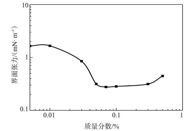 根據(jù)吉布斯吸附理論,為了達到超低油/水界面張力,表面活性劑分別與油相和水相發(fā)生強的相互作用并且在油水界面達到飽和吸附。這要求表面活性劑同時具有大的親水基和疏水基。不同濃度的表面活性劑TPHS溶液與大慶原油間的界面張力如圖3所示,隨著表面活性劑TPHS質(zhì)量分數(shù)的增大,界面張力先減小后緩慢增大,在較大的濃度范圍內(nèi)可保持在10-1mN/m數(shù)量級。TPHS質(zhì)量分數(shù)為0.07%時,界面張力達到最低,為0.276 mN/m。TPHS具有較好的降低油水界面張力的能力。