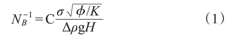 NB-1為滲吸機(jī)理判別參數(shù),式中沒有考慮巖石潤濕性。NB-1>5時(shí),毛管力在滲吸作用中起主導(dǎo)作用;1<NB-1<5時(shí),重力和毛管力同時(shí)起作用;NB-1<<1時(shí),重力起主導(dǎo)作用。