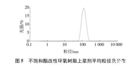 制備的不飽和酯改性環(huán)氧樹脂上漿劑乳液的性能測試結果見表5,粒徑及分布測試結果見圖5。