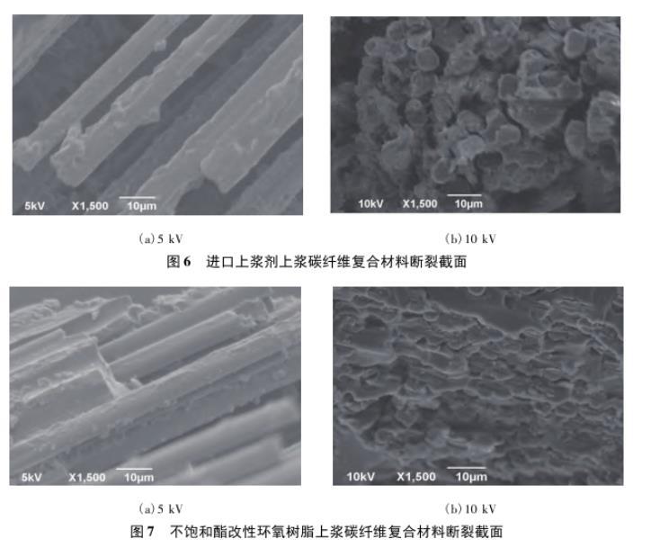 復合材料斷裂截面圖顯示,采用進口上漿劑制備的碳纖維在部分區(qū)域未能有效吸附上漿劑組分,出現(xiàn)纖維的滑脫和粘連等不良現(xiàn)象。采用不飽和酯改性環(huán)氧樹脂上漿劑制備的碳纖維表面均勻涂覆上漿劑高分子,并與酚醛基體樹脂粘結成一體,纖維很難從樹脂中滑脫,界面結合性能良好。測試結果表明,不飽和酯改性環(huán)氧樹脂上漿劑能有效改善上漿碳纖維與不同基體樹脂的適用性,具有更好的通用性。