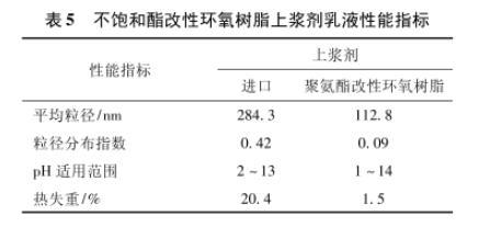 由表5結果可見:不飽和酯改性環(huán)氧樹脂上漿劑為微乳液,平均粒徑更小,離心沉淀量低,更易長時間儲存應用;可在較寬的pH范圍內(nèi)保持穩(wěn)定,熱失重程度小,耐溫性高,可滿足各種不同復合材料樹脂基體高溫、中溫、低溫加工工藝的需求。