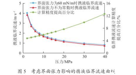 (1)界面張力對(duì)攜液臨界流量影響。如圖5所示為氣體相對(duì)密度為0.7,溫度為100℃時(shí),利用新模型計(jì)算當(dāng)界面張力為常數(shù)(60 mN/m)和界面張力隨壓力變化時(shí)不同壓力下的攜液臨界流速??紤]界面張力變化的攜液臨界流速要比界面張力為常數(shù)時(shí)的小,計(jì)算精度更高。且隨著壓力的增大,攜液臨界流速的計(jì)算精度提高百分比,逐漸從4%上升至12.5%,平均提高了8%。