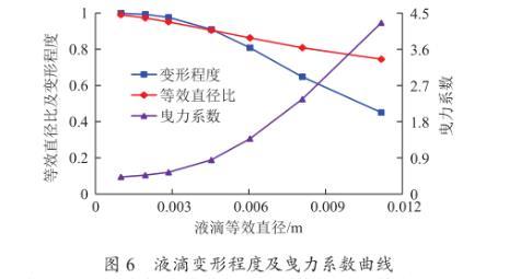 (2)液滴尺寸和液滴變形。如圖6所示為壓力15 MPa,溫度50℃時(shí)不同液滴尺寸下液滴變形程度、曳力系數(shù)的變化趨勢(shì)。從中可知,當(dāng)液滴特別小時(shí)(1 mm),等效直徑比及變形程度系數(shù)接近1,曳力系數(shù)近似0.44,液滴呈球形基本不發(fā)生變形;隨著液滴尺寸從1 mm增大到10 mm時(shí),等效直徑比從1減小到0.75,變形程度系數(shù)從1減小到0.45,曳力系數(shù)從0.44增大到4.3,液滴呈橢球形變形程度逐漸加大。