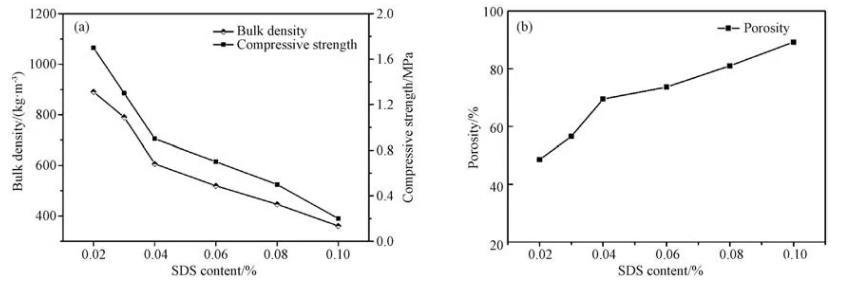圖1為固含量60%、SDS摻量分別為0.02%、0.04%、0.06%、0.08%、0.1%下所制備的多孔陶瓷坯體,經過1190℃、保溫2 h燒結后的樣品性能。從圖中可以看出,多孔陶瓷樣品的體積密度和抗壓強度隨發(fā)泡劑摻量的增加而減小。當SDS的摻入量由0.02%提高至0.1%時,樣品的密度由890.53降至361.0 kg/m3,抗壓強度由1.7下降至0.2 MPa。當SDS溶于水并經過高速攪拌后,SDS分子可以吸附到氣液界面上降低表面張力并產生大量的氣泡,這些氣泡會緊密堆積在一起,氣泡之間有液膜將其隔開,將氣泡引入到陶瓷漿料中后,陶瓷原料分散在氣泡液膜間,形成骨架支撐,干燥后陶瓷原料液相消失,固化形成含孔隙的多孔陶瓷坯體,引入的氣泡越多,多孔陶瓷的孔隙率越高,孔壁越薄,陶瓷骨架越細;當氣泡的引入量過多時,骨架易發(fā)生斷裂,此時多孔陶瓷的抗壓強度就會降低。