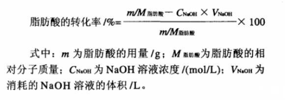 脂肪酸轉(zhuǎn)化率的測(cè)定:以酚酞為指示劑,用0.05mol/L NaOH溶液滴定反應(yīng)液中未反應(yīng)完的脂肪酸量。計(jì)算脂肪酸的反應(yīng)轉(zhuǎn)化率。