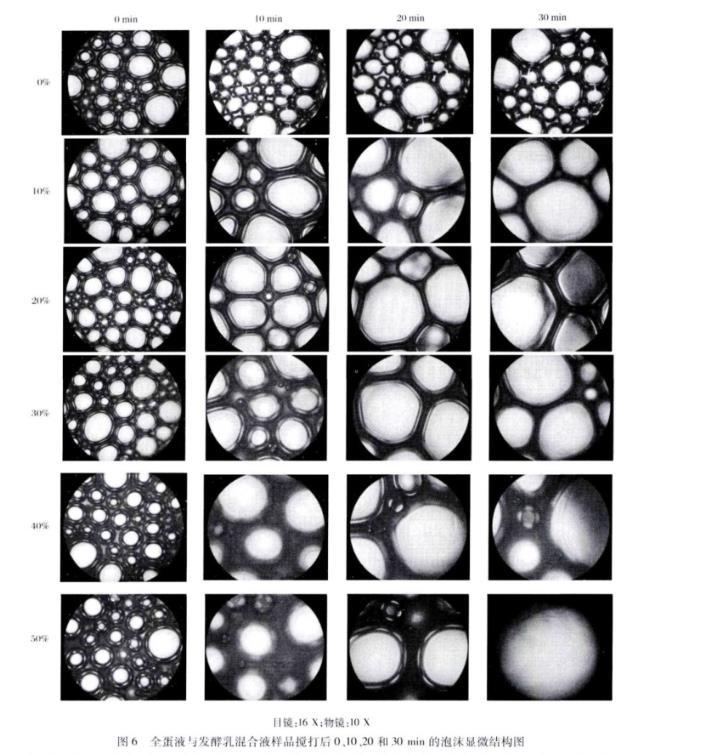圖6為全蛋液與不同量的ST5-24 h發(fā)酵乳混合物經過攪打后的泡沫放置0、10、20和30 min時的顯微結構圖,其中目鏡和物鏡的放大倍數(shù)分別為16 X和10 X。由圖6可以看出,在0 min時,發(fā)酵乳含量為0%~30%的氣泡小而稠密,而40%和50%的氣泡大小不一且稀疏,說明混合液的起泡性在發(fā)酵乳含量大于30%時開始降低。此外,在發(fā)酵乳含量較少時,氣泡之間連接比較緊密;而發(fā)酵乳含量較高,尤其是在發(fā)酵乳含量為50%時,氣泡呈分散狀態(tài),并且在氣泡底部有少量析出的液體(圖中灰色部分)。