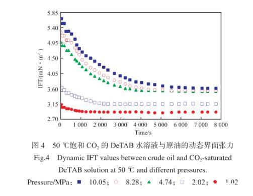 圖4為50℃、飽和CO2的DeTAB水溶液與原油的動(dòng)態(tài)界面張力。由圖4可知,在DeTAB水溶液/CO2/原油體系中,初始階段,油水兩相的動(dòng)態(tài)界面張力下降較快,當(dāng)動(dòng)態(tài)界面張力接近平衡界面張力時(shí),變化趨于平緩,壓力越高界面張力達(dá)到穩(wěn)定所需時(shí)間越長(zhǎng)。在壓力大于4.7 MPa時(shí),界面張力穩(wěn)定所需時(shí)間在4 500 s以上,遠(yuǎn)大于CO2不存在時(shí)所需的穩(wěn)定時(shí)間。原因是表面活性劑水溶液中的CO2通過緩慢的擴(kuò)散作用溶解到原油中,造成油水兩相動(dòng)態(tài)界面張力不斷變化。