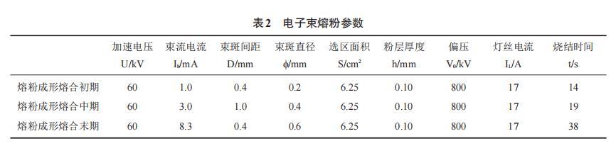 (1)試驗結(jié)果吻合熔粉理論模型,在熔合初期電子束預熱工藝下,離散的粉末微小粒徑的顆粒幾乎完全熔入大顆粒當中,且顆粒與顆粒之間呈凝聚態(tài)結(jié)構(gòu)。