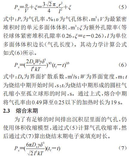 為了有足夠的時間排出沉積層里面的氣孔,仍使用體積收縮模型,通過式(5)計算氣孔收縮率,然后通過式(7)算出燒結(jié)末期電子束填充時長。