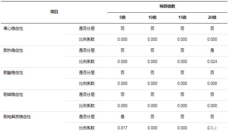 1)經(jīng)過稀釋后,耐熱穩(wěn)定性、耐電解質(zhì)穩(wěn)定性兩個測試項(xiàng)目雖然出現(xiàn)分層情況,但是比例系數(shù)均在0.1以下,氨基改性硅油柔軟劑保持較好的穩(wěn)定性;