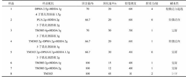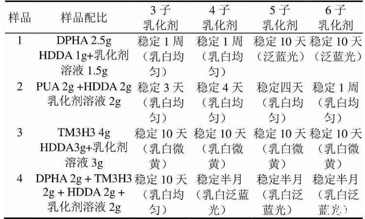 中和后得到的桐油基多子乳化劑能夠乳化黏度較大的光固化單體及低聚物形成穩(wěn)定的水乳液。不同乳化劑乳化性能不同,其穩(wěn)定性和外觀也有較大差別,乳液性能列于表1。6子乳化劑乳化的HDDA水乳液(固含量60%)的穩(wěn)定性能達(dá)到3個月以上,乳液長期放置分層后經(jīng)攪拌能二次乳化形成均勻的乳液。