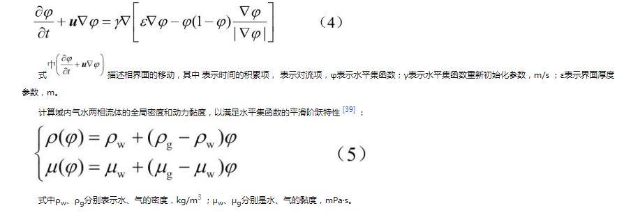 式描述相界面的移動(dòng),其中表示時(shí)間的積累項(xiàng),表示對(duì)流項(xiàng),φ表示水平集函數(shù);γ表示水平集函數(shù)重新初始化參數(shù),m/s;ε表示界面厚度參數(shù),m。