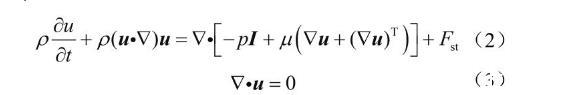 式中ρ表示流體密度,kg/m3;u表示速度矢量,m/s;p表示壓力,Pa;I表示單位矩陣;μ表示流體的動(dòng)力黏度,mPa·s;Fst表示氣水兩相的界面張力,N/m。