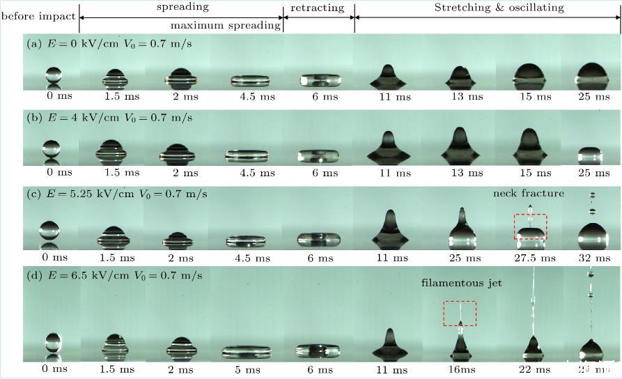 實驗中,通過將液滴釋放高度從25 mm調整到65 mm來改變液滴的撞擊速度,根據撞擊前兩個連續(xù)圖像的移動垂直距離除以圖像一幀時間(0.25 ms)得到撞擊初速度V0,其范圍在0.7~1.129 m/s之間。另外通過調節(jié)高壓電源的輸出電壓U(0~30 kv)來控制電場強度E(