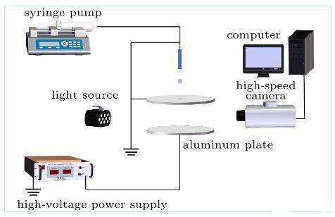 在本實驗中,將兩塊直徑為10cm的圓形鋁板沿著垂直方向放置,其間隔固定為20mm。在上極板中心位置開一個直徑為5mm的孔口,以便液滴從上極板上方滴落,穿過上極板與下極板發(fā)生撞擊行為。為了實現垂直電場的形成,將高壓直流電源與下極板相連,上極板作接地處理,這樣的結構產生了一個垂直電場和一個帶電的基底。此外,不銹鋼針管(G24,外徑0.55m,內徑0.27mm)通過毛細管連接到微流注射泵上,使液滴以恒定的撞擊速度滴落到下極板。為了消除靜電對實驗的影響,將針管作接地處理,確保液滴在進入電場之前不攜帶任何感應電荷。
