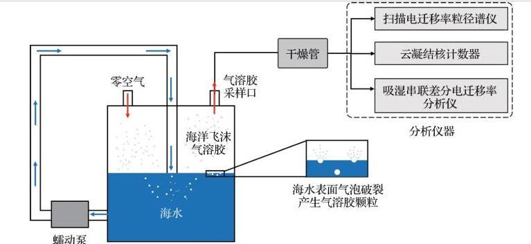 SSA生成裝置能夠在實驗室環(huán)境中模擬自然海洋系統(tǒng),實現(xiàn)在受控條件下從天然海水中產(chǎn)生SSA,并結合儀器表征顆粒的粒徑分布和理化特性。目前常用的模擬裝置有鼓泡式發(fā)生器、射流式發(fā)生器及波浪破碎式發(fā)生器等。本文以射流式SSA發(fā)生器為例,介紹SSA的生成原理(圖2)。通常來說,發(fā)生器都具有進水口、進氣口和采樣口。利用蠕動泵將海水從發(fā)生器底部周期性循環(huán)到頂部噴嘴,形成一個俯沖射流水柱,撞擊水面并將空氣夾帶進入海水中,在水下一定深度產(chǎn)生氣泡羽流。當氣泡上升到水氣界面并破裂時,產(chǎn)生SSA顆粒。采用潔凈零空氣作為載氣,將生成的SSA顆粒通過氣溶膠采樣口進行采集,連接干燥管進行干燥。此后,使用掃描電遷移率粒徑譜儀測量SSA的粒徑分布和數(shù)濃度等。該裝置可連接其他儀器,如CCN計數(shù)器和吸濕串聯(lián)差分電遷移率分析儀等進行CCN活性及吸濕性等的表征。